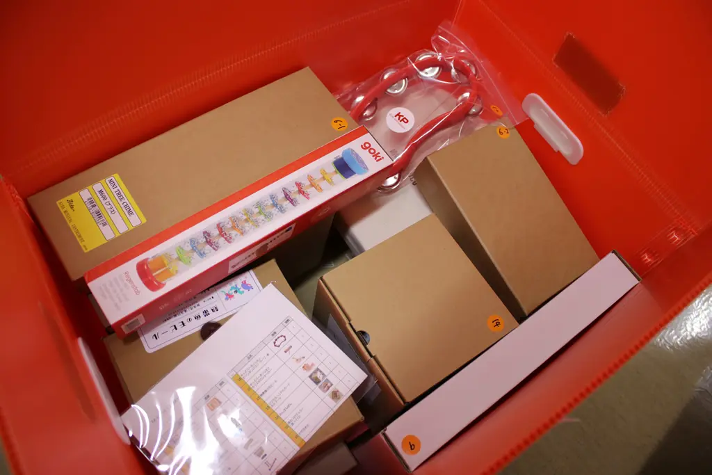 その一角で、あそびのむしセットの箱詰め作業も行われています。日替わりで、3~4名が箱詰めを担当するそうですが、この日、鮮やかな赤とオレンジの箱のそばで作業を行っていたのは、りょうこさん、はなこさん、ささもとさんの3名でした。