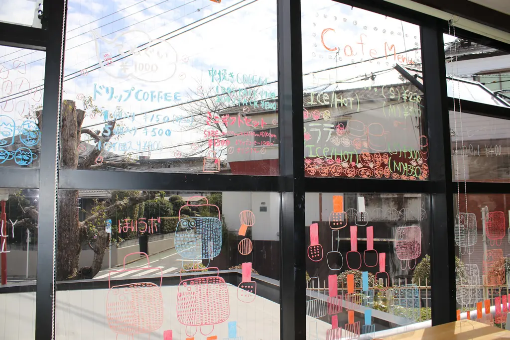 窓には、園のイベントの際に描かれたコーヒーメニューが